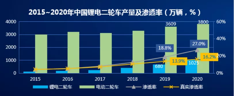 《新國標(biāo)》之后,兩輪電動車面臨的最大問題就是如何將車重降到55kg以內(nèi),這直接推動了重量僅約鉛酸蓄電池三分之一,技術(shù)含量和電容量卻更高的鋰電池在國產(chǎn)兩輪電動車之中的滲透率。