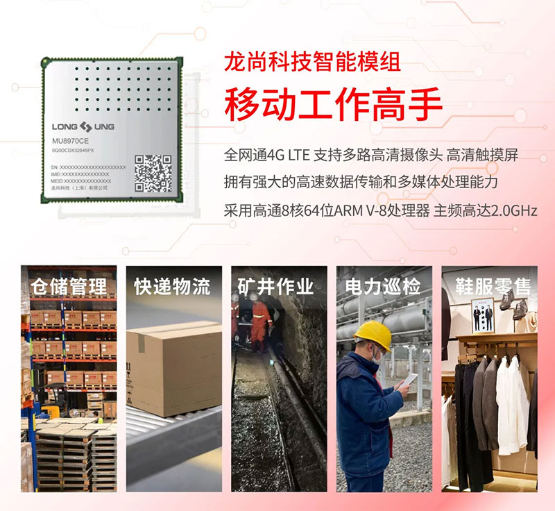 龍尚科技MU8970CE是一款搭載Android系統(tǒng)的無(wú)線(xiàn)通信LTE Cat 4智能模組,采用高通8核64位ARM V-8處理器,主頻高達(dá)2.0GHz,內(nèi)置Adreno? 610 GPU,支持多路高清攝像頭,高清觸摸屏,擁有強(qiáng)大的高速數(shù)據(jù)傳輸和多媒體處理能力,有助于客戶(hù)利用智能模塊的操作系統(tǒng)和高性能等優(yōu)勢(shì),快速地開(kāi)發(fā)和多媒體、無(wú)線(xiàn)通訊等功能相關(guān)的產(chǎn)品和應(yīng)用。MU8970CE可完美適應(yīng)物流、倉(cāng)儲(chǔ)、醫(yī)療、零售、資產(chǎn)管理等眾多行業(yè)的應(yīng)用,助力客戶(hù)顯著提升運(yùn)營(yíng)及管理水平。