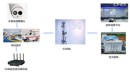 內(nèi)置5G通信模組的智能穿戴式裝備、移動(dòng)會(huì)診客戶端、救護(hù)車載、直升機(jī)數(shù)據(jù)采集端等,實(shí)現(xiàn)音視頻、影像及醫(yī)療檢測數(shù)據(jù)傳輸?shù)街笓]調(diào)度平臺(tái),使院內(nèi)專家遠(yuǎn)程指導(dǎo)院前醫(yī)生實(shí)施現(xiàn)場救治。